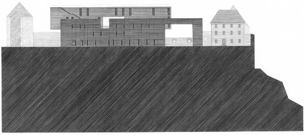 Der Theaterkörper ist der Charakter des Theaters, der zum Hof hin durch die Wand maskiert wird. Die Wand ist die Maske der Erinnerung, die die alte Ordnung nachzeichnet und aus der heraus der Theatercharakter des Burghofes verstärkt wird. Die Maske zeichnet stilisiert die wichtigsten Eigenschaften des Dahinter nach. Durch Einschnitte in der Wand werden hier die Stationen des öffentlichen Weges, der zwischen Wand und Körper auf das Dach führt, verdeutlicht. Die erste Station des Weges ist der Eingangshof des Theaters. Er orientiert sich zum Burgplatz und wird durch das große Tor inszeniert. Die zweite Station ist die Loggia im Theaterkörper. Diese orientiert sich zur Stadt und ist in der Wand nur als kleiner Einschnitt zu erkennen. In der Loggia kreuzen sich die Wege von zufälligem Betrachter, Theaterbesucher und Künstler. Der Weg bietet somit einen Blick hinter die Maske. Die Treppe steigt später hinter der Wand hervor und endet auf dem flachen begehbaren Dach des Theaterkörpers, von dem der Blick in alle Richtungen frei ist. Eine scheinbare Dreigeschossigkeit der Maske unterstützt den Kulissengedanken und gliedert die Wand in den Zusammenhang der Hofgebäude ein. Die Lichtschlitze wirken als Karikaturen von Fenstern. In den Bereichen der Foyers werden die Öffnungen nach außen so angeschnitten, daß sie die steigende Konzentration des Raumes dahinter verdeutlichen. >> |