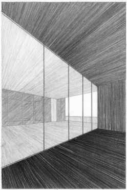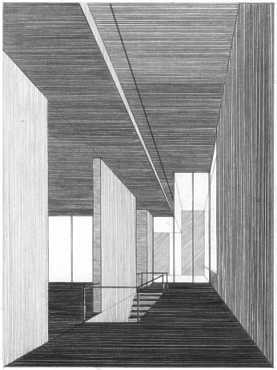 Über die Treppe , die sich im Foyer an der Stadtmauer befindet, betritt der Besucher den Theaterkörper. Hier befindet sich ein kleines Foyer, an das sich der kleine Saal anschließt. Beide Räume öffnen sich zur Loggia.Gegenüber befindet sich ein weiträumiges Atelier. Über die Loggia kann dieses mit dem kleinen Saal zu einer Einheit verbunden werden. Da die Loggia über die Fuge zwischen Wand und Körper öffentlich zugänglich ist, ist es möglich, hier unabhängige Veranstaltungen durchzuführen, beziehungsweise den zweigeschossigen Raum an der Stadtseite zu kleineren Arbeitsausstellungen zu nutzen. Grundriss >> |