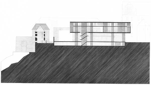 Der Raum zwischen Stadtmauer und Wand wird zum Theaterraum. Im zweigeschossigen Körper darüber befinden sich die Theaterfunktionen, wie Probe, Atelier und Künstlergarderoben. >> |
