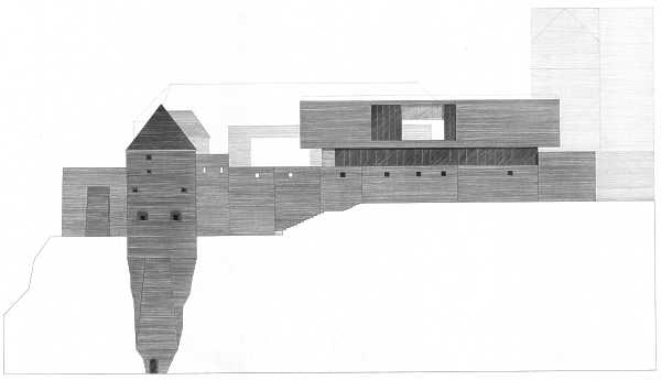 Der Theaterkörper nimmt den Kontakt mit der Stadt auf, indem er leicht über die Stadtmauer "spielt". Eine Loggia präsentiert sich wie eine Bühne oder Loge zur Stadt. Diese Loggia ist öffentlich zugänglich und lässt den Besucher einen inszenierten Blick auf die Stadt erleben. Gleichzeitig wirkt sie aber auch zeichenhaft zur Stadt. Beleuchtungsmöglichkeiten können das Geschehen in Theater von aussen indirekt erlebbar machen. >> |